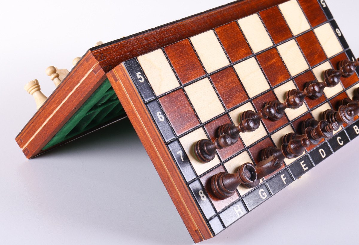 Magnets keep the pieces steady and make possible to travel with this chess set. Extra number and letter coordinates line the chessboard's edge, a rarity. The classic chess piece style is easy to recognize for any chess player, even beginners.