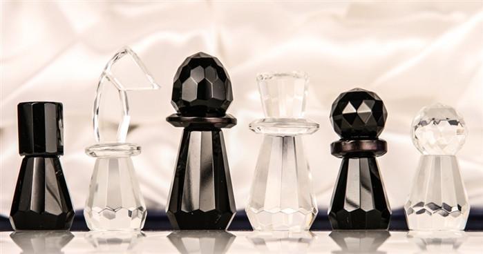 Mirror finish reflects smiles and joy on this stunning crystal chess set, a marvelous gift idea for that extra special wedding, anniversary, or graduation.